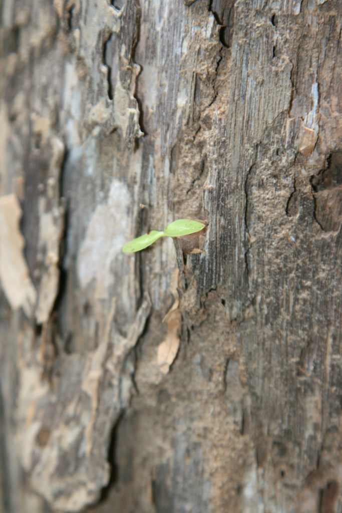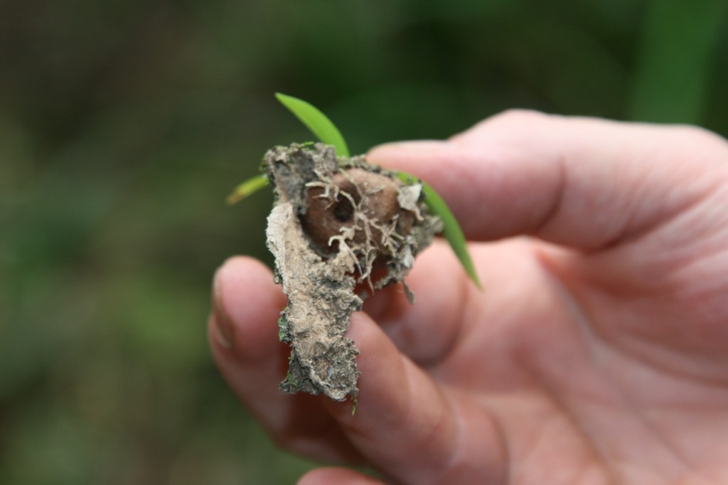 We saw evidence of young ant-plants growing in carton-covered ant passages (photos below). Their roots grew into the carton and their first major cavity was exposed inside the ant trail. We also saw groups of recently germinated ant-plants on trees, indicative of seed distribution by ants (as demonstrated by Sommer (1990) for M. beccarii and Phylidris cordatus).