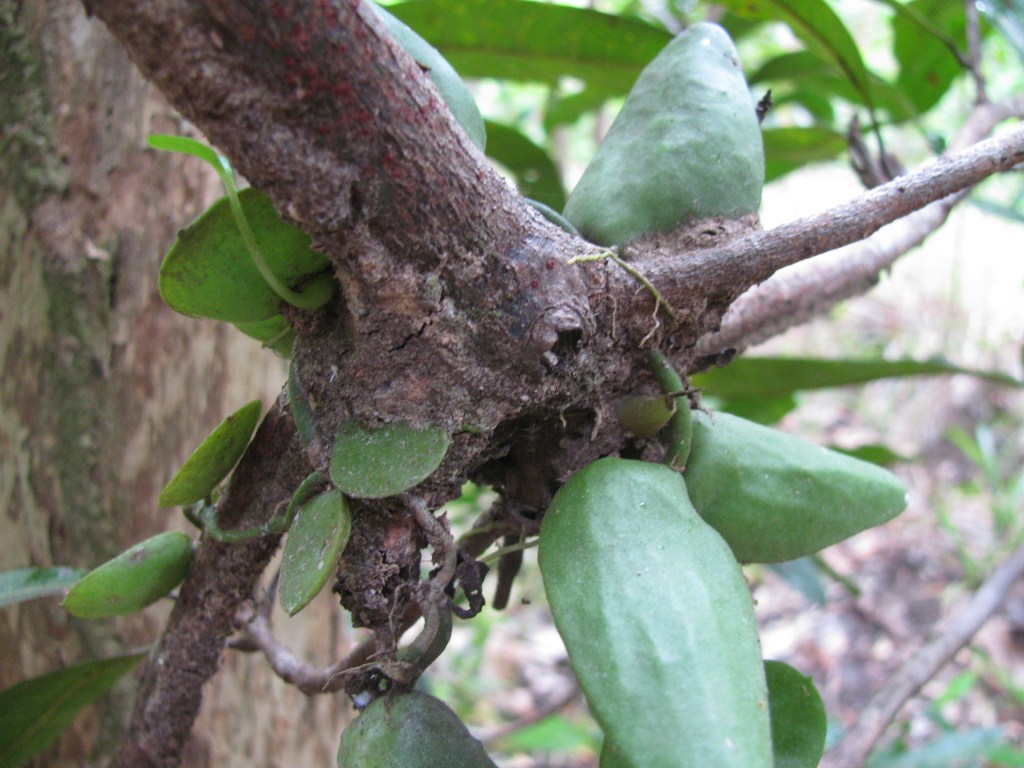 Another CAM ant-plant in the forests is Dischidia major, an epiphytic vine with hollow leaves in which ants live. The plant inserts roots into the leaf hollows in order to extract nutrients deposited by the ants. Dischidia is wind-pollinated, unlike Myrmecodia and Hydnophytum, and although ants may build their carton-covered passages to and from Dischidia plants (photo below) there is no record of Dischidia seeds germinating from the ant carton i.e. no evidence that ants are a vector for Dischidia seed dispersal.
