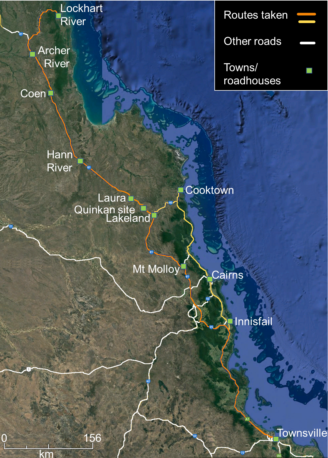 We camped at roadhouses, the rainforest site at Iron Range, pub at Laura, caravan park at Atherton, and visited Black Mountain near Cooktown.