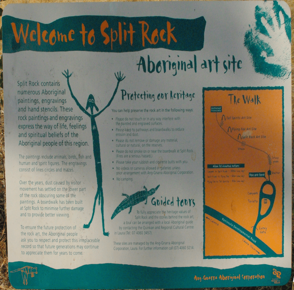Split Rock, a sandstone formation containing rock paintings, is an amazing spot about 14 km south of Laura. The art features Quinkans, or spirit-being figures, and animal depictions. The traditional owners and managers of the site, the Ang-Gnarra Corporation, run interpretive tours (https://www.anggnarra.org.au/our-country/rock-art) not only at Split Rock but at other sites in ‘Quinkan Country’.