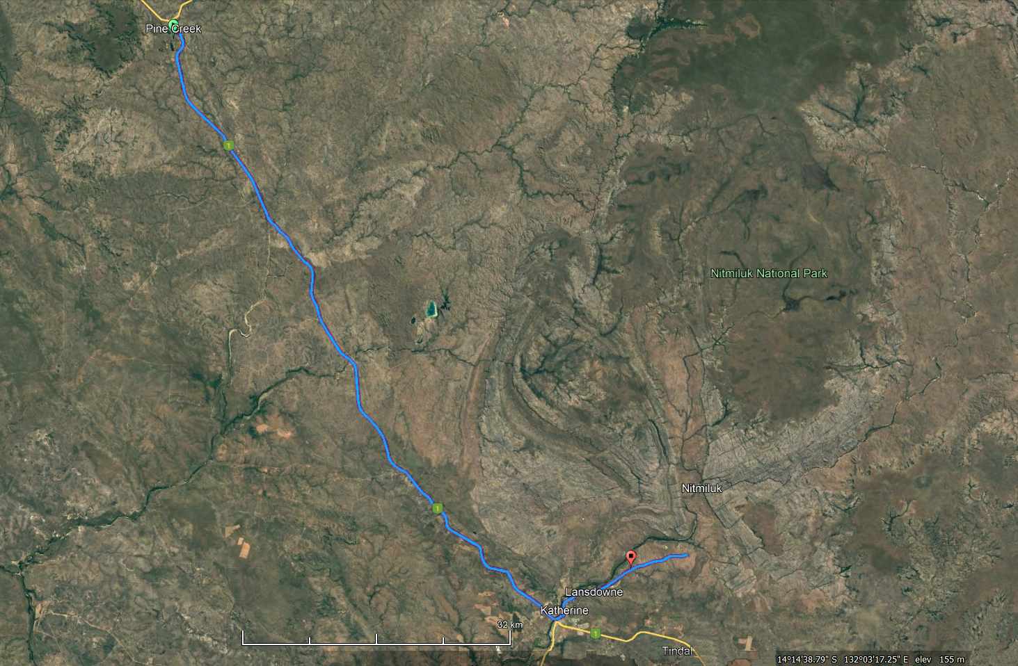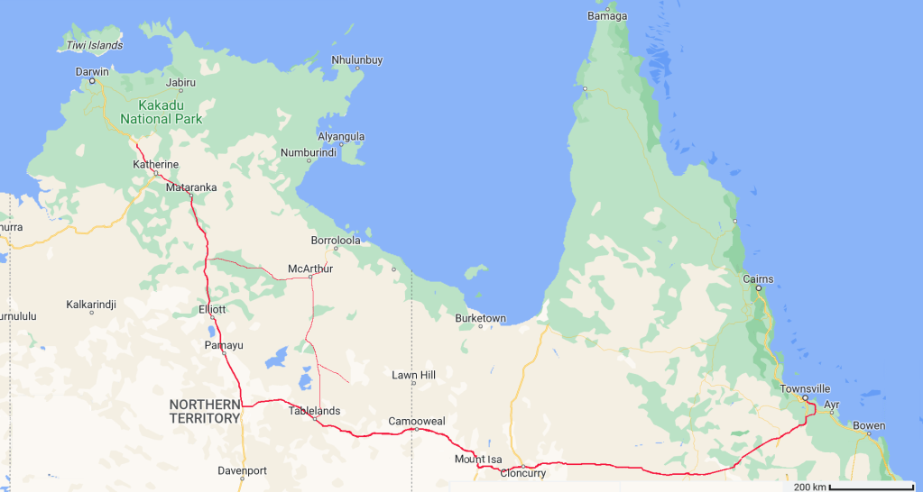 A long road trip – 900 km to camp at Mt Isa in western Queensland, 637 km to camp at Threeways (NT), 547 km to camp at Mataranka Thermal Pool (NT), a more relaxing stop, and thence 205 km to Pine Creek, arriving on 12th May. Pungalina is a further 765 km south and east from Pine Creek.