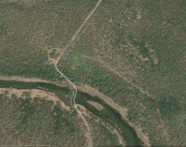 by the Daly River at Oolloo Crossing Conservation Area (-14.06935 o S, 131.25084 o W), a spot surrounded by African mahogany plantations (Khaya senegalensis) and savanna woodland cleared for large agribusiness concerns;