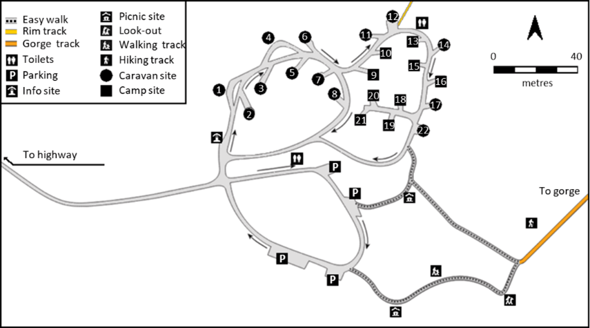 The camp-ground is the origin of a walk to the rim (2.4 km roundtrip, 1 h) and a Gorge-walk (2.6 km roundtrip, 1.5 h). The rim walk is level with a few sections scattered with small rocks. It starts near camp site 12, passes through open eucalypt and Acacia woodland, and leads to the Gorge edge with an excellent view of the Pyramid downstream.