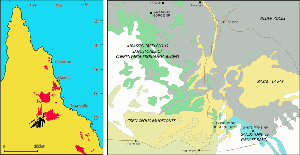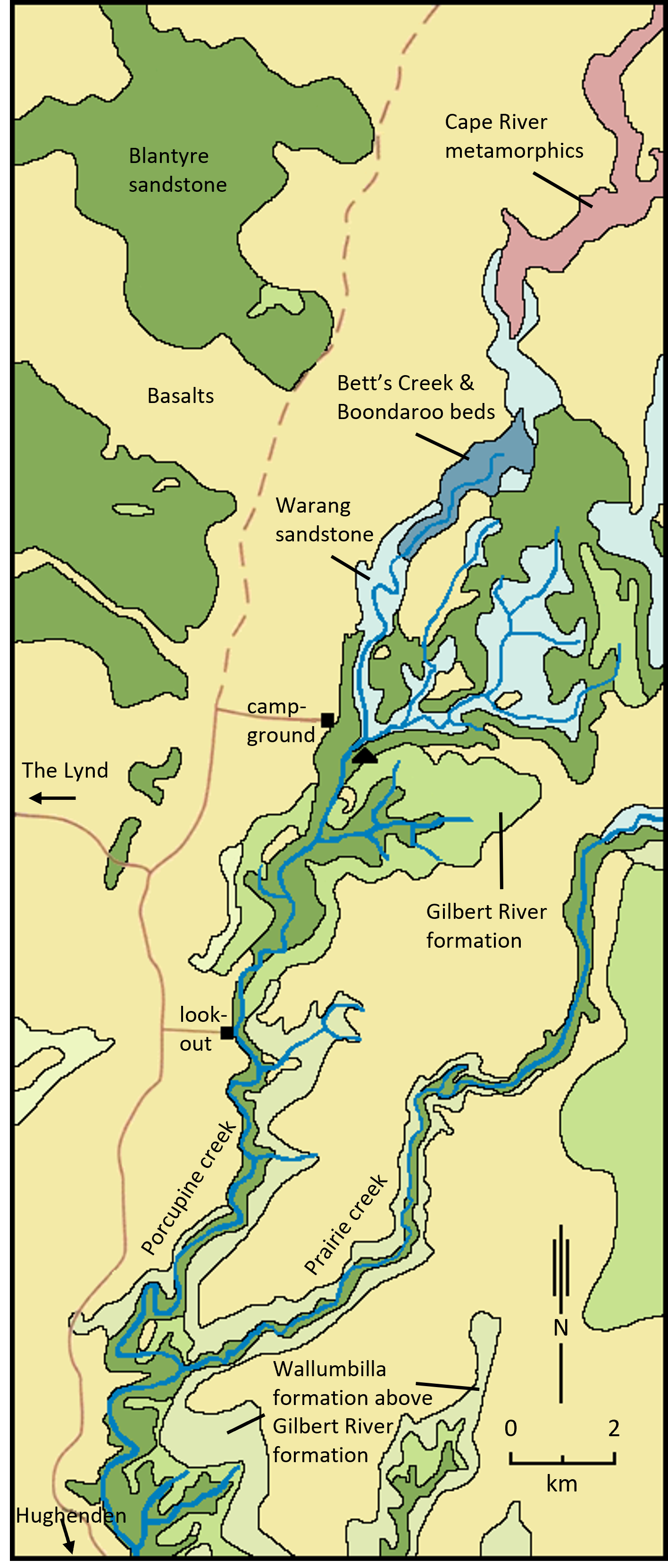 At Porcupine Gorge, Porcupine Creek (aka Galah Creek) has eroded through parts of the basalt cap, scouring and exposing underlying sandstones and metamorphics to ca 120 m.