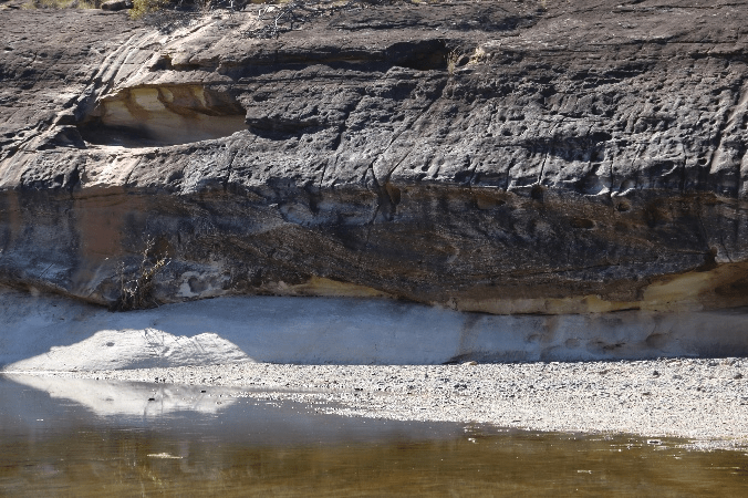 Further upstream around a long bend to the left, the sandstone becomes coarser, with beds and patches of conglomerate, and there are also more beds of siltstone, shale and black carbonaceous shale. The older Permian Bett’s Creek beds and the Boondaroo beds, and the Cambrian-Ordovician Cape River Metamorphics (Charters Towers Precinct) become visible. The lower section of the Bett’s beds contains interbedded siltstone and mudstone with some sub-bituminous coal seams. Above these are larger mudstone beds that contain fossils of the Glossopteris flora (Whitehouse 1940), a Permian and Gondwanan indicator. The uppermost layers are sandstone with intermittent mudstone.