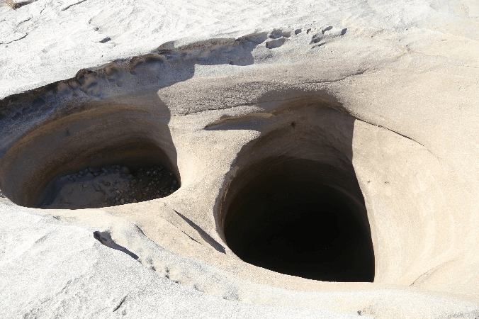 The coarse, occasionally pebbly, white Warang sandstone has been sculpted by the stream. Cross-bedding can be seen in places. Downstream, the potholed pavement ends in sand-drift and pools at the foot of The Pyramid.