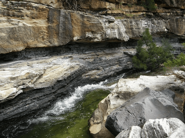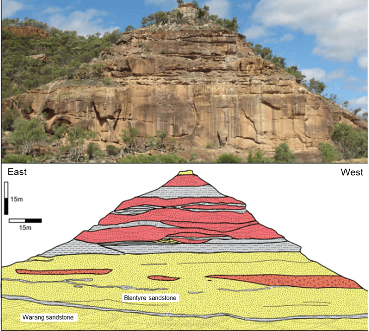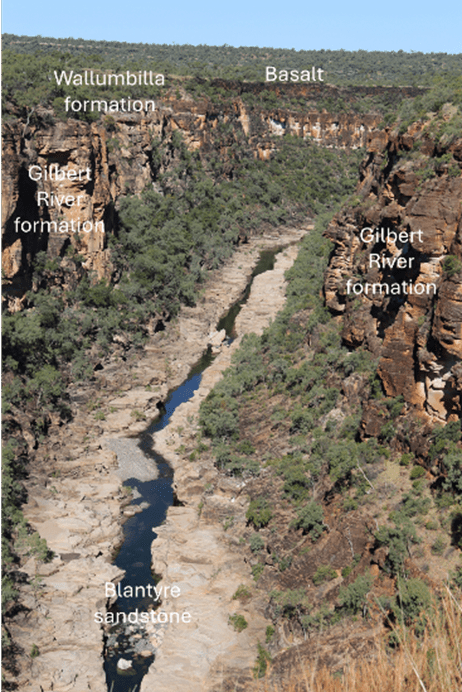 According to Willmott et al (2017), upstream from the spot where the track enters the bottom of the Gorge, the Warang Sandstone is exposed in the stream bed and in cliffs on both sides for some kilometres. The Blantyre Sandstone thins out (probably eroded), until cliffs of black basalt high in the gorge walls lie directly upon the Warang Sandstone. The Warang Sandstone has a kaolinite clay matrix and patches of it have disintegrated through softening by groundwater and erosion by wind to create overhangs and shallow caves. Upstream, after a long bend to the right where blocks of sandstone have fallen, some beds of weathered siltstone and shale within the Warang Sandstone are visible in the cliffs. Erosion of these soft rocks has resulted in the collapse of the sandstone above.