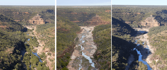 The landscape at the gorge bottom reflects water flows through the Gorge – the left image below was taken before the 2019 floods, the right image afterwards (Tattersall 2025)!