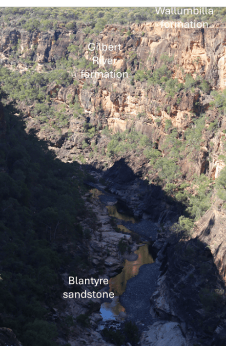 At the end of the walking track, the junction, or unconformity, between the Warang and overlying Blantyre Sandstone is visible in the bank opposite, sloping to the south. Downstream is the Pyramid, a spur of brown, flat-bedded Blantyre Sandstone that has been cut off by the gorge and a side-gully to form equally-inclined sides. Thin beds of reddish sandstone at its top may belong to the overlying Gilbert River Formation. The line where the Blantyre Sandstone lies on top of the Warang Sandstone is above the pool at the base of the Pyramid.