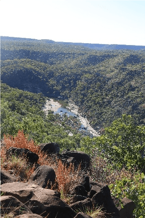Circa 63 km north of Hughenden is a 2 km track to a lookout on the edge of the middle Gorge. The upstream (northerly) and downstream (southerly) views provide insight into processes that formed it, the strata it dissects, and the vegetation. At the base of the Gorge is the stream-gouged trough. Depending upon recent water flows the base may be lined with vegetation or scoured. The cliffs and scree host vine thicket, eucalypts and acacias.