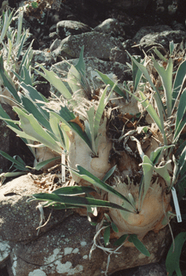 Progress: Platycerium veitchii performs very low-level CAM (Holtum and Winter 1999). On the shifting exposed granite boulder scree slopes near Townsville, where it tends to inhabit the edges of patches of vine thicket, P. veitchii grows from cracks between rocks and forms communal nests that store water and nutrients and reduce heat stress (Keto et al 1995).
