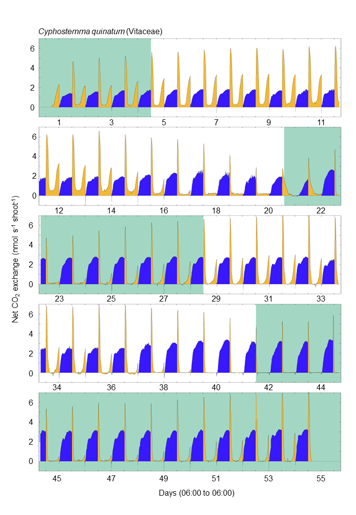 The signal was more akin to a cryptic CAM species in which the CAM signal was strengthening slightly. Under well-watered conditions, low levels of net CO2 uptake occasionally occurred towards the end of the night. The pattern was similar when the plant was subjected to water-deficit stress.