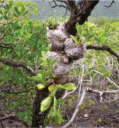 The ants, often Philidris cordata (sub-fam. Dolichoderinae) in Australia, tend to inhabit smooth-walled cavities in the stems and store wastes in cavities with walls that contain warty lenticel-like protrusions. There is good evidence that ants may assist dispersal, at least on a single tree, by transporting viable seeds away from the parent (Sommer 1979, Chomicki and Renner 2016). Seeds are sometimes incorporated into frass-covered pathways that the ants construct on the stem of the host tree.