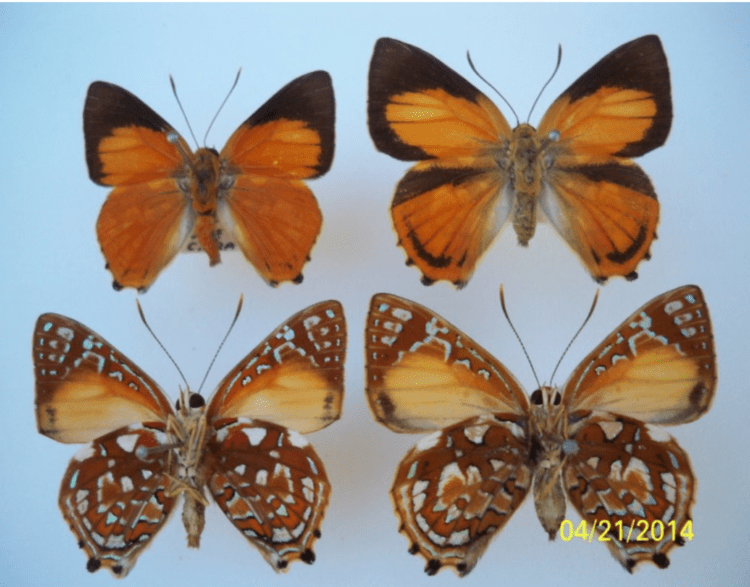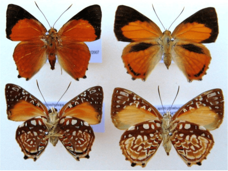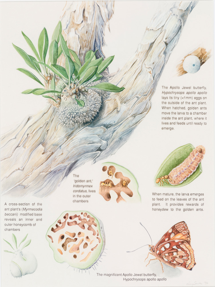 Ant-plants often interact with organisms apart from their host trees and ants. For example, the mistletoe bird (Dicaeum hirundaceum, fam. Nectariniidae) is thought to eat fruit and to move seeds between trees. Mymecodia beccarii often grows with epiphytic orchids, Dischidia and ferns, and occasionally hosts larvae of the southern subspecies of the Apollo jewel lycaenid butterfly, Hypochrysops apollo apollo. Myrmecodia tuberosa may host larvae of the northern Apollo jewel, Hypochrysops apollo phoebus.